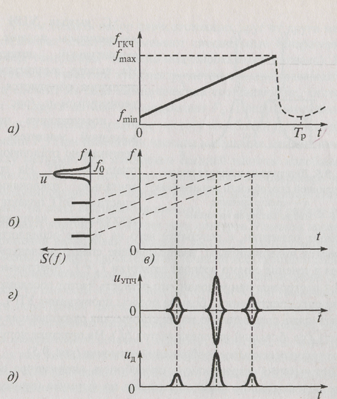 в — линейное изменение частоты во времени; г — сигнал на выходе УПЧ;