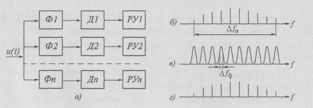 Анализаторы параллельного типа чаще применяют для анализа спектров одиночных импульсных сигналов. Схема анализатора содержит п полосовых фильтров Ф, каждый из которых настроен на определенную частоту (рис. 9.2, а). Исследуемый сигнал u(t), спектр которого расположен в полосе частот Δfn (рис. 9.2, б), подают на все фильтры одновременно. Фильтры имеют идентичные АЧХ с одинаковыми полосами пропускания Δfф и настроены на определенные частоты (рис. 9.2, в). Сигналы на выходе фильтров определяют составляющие спектра анализируемого процесса (рис. 9.2, г).