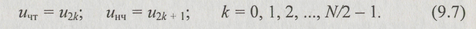 Формулы (9.8) и (9.9) представляют собой алгоритмы БПФ. В них экспоненциальные фазовые множители exp(-j2πnk / N) учитывают влияние сдвига нечетной подпоследовательности относительно четной. Чтобы еще уменьшить число вычислений, четную и нечетную подпоследовательности также разбивают на две промежуточные части. Разбиение продолжают вплоть до получения простейших двухэлементных последовательностей. При объединении ДПФ четной и нечетной подпоследовательностей используют алгоритмы (9.8) и (9.9), подставляя в них соответствующие значения номеров N и п.