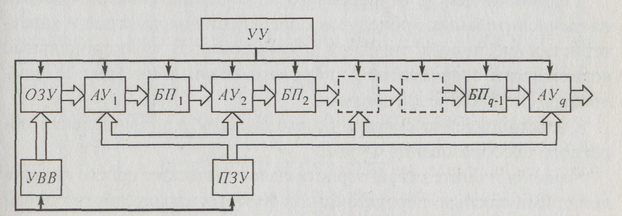 Структурная схема цифрового анализатора спектра, реализующая один из алгоритмов БПФ, показана на рис. 9.6. В схеме используют: процессоры БПФ с каскадной структурой организации параллельной работы; q = log 2 N арифметических устройств АУ; q - 1 блоков памяти БП емкостью 2i комплексных слов каждый. В режиме реального времени все N отсчетов обрабатываемой группы через устройство ввода-вывода информации УВВ поступают в ОЗУ. Последним тактом ввода группы отсчетов к ОЗУ последовательно подключают блоки АУ, осуществляющие обработку информации в соответствии с заданным алгоритмом БПФ. Служебная информация о комплексных весовых коэффициентах