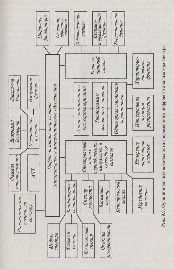 Принцип действия цифрового анализатора спектра основан на вычислительных процедурах определения параметров и характеристик различных сигналов и процессов. В функциональные возможности современного цифрового анализатора (рис. 9.7) заложены следующие алгоритмы:
