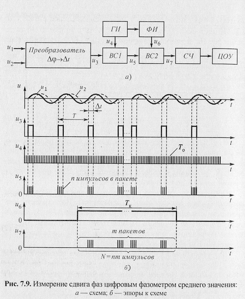 Для уменьшения погрешностей измерения используют цифровые фазометры среднего значения, результатом измерения которых является среднее значение измеряемого фазового сдвига за большое число периодов Т анализируемого гармонического колебания. Структурная схема цифрового фазометра среднего значения с поясняющими эпюрами представлена на рис. 7.9. Она отличается от схемы (см. рис. 7.8, а) рассмотренного выше фазометра наличием второго временного селектора ВС2, генератора импульсов ГИ и формирователя импульсов ФИ.