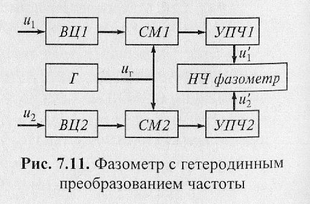 Структурная схема фазометра с подобным преобразованием показана на рис. 7.11. Пусть через входные цепи ВЦ1 и ВЦ2 на смесители СМ1 и СМ2 преобразователя частоты поступают соответственно сигналы
