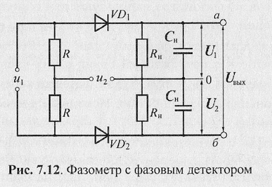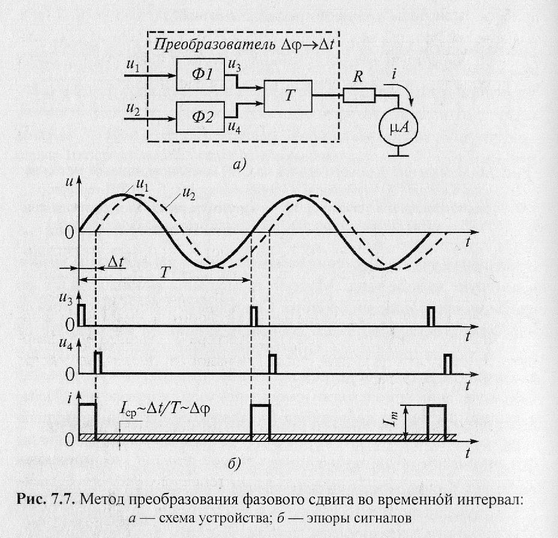 Этот метод обеспечивает измерение фазового сдвига практически в пределах от 0 до 360°. Сущность метода поясняют схемы и диаграммы, показанные на рис. 7.4. для случая измерения фазового сдвига между сигналами