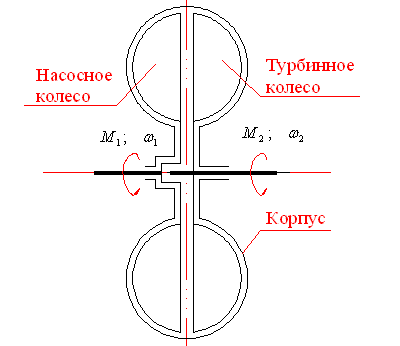 Фактически насосное колесо представляет собой лопастной насос, турбинное — лопастной гидравлический двигатель. Оба эти колеса находятся в одном герметичном корпусе и максимально сближены друг с другом (но не соприкасаются), и жидкость при вращении насосного колеса попадает непосредственно на турбинное колесо, сообщая последнему вращающий момент.