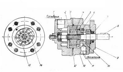 В чугунном корпусе 12 и крышке 1 смонтировано закаленное кольцо-статор 3, имеющее внутри профилированную поверхность, по которой скользят двенадцать лопаток 14, свободно перемещающихся в пазах ротора 4.