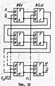 обеспечивает сдвиг информации на один разряд вправо. Для сдвига на m разрядов требуется m таких посылок. Две последовательности управляющих-сигналов