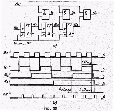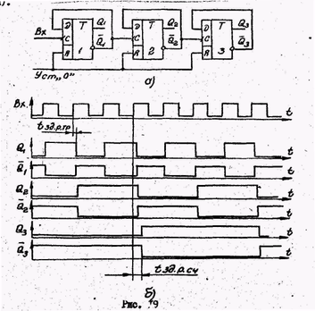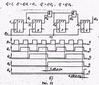 В счетчике (рис. 20а), построенном на двухступенчатых Т-триггерах, сигнал переноса в следующий разряд; снимается с прямого входа триггера. Это связано с тем, что переключение второй ступени двухступенчатого триггера происходит в тот момент, когда на входе его появляется отрицательный перепад. Тогда, если триггер предыдущего разряда счетчика переключается в нулевое состояние. на прямом входе формируется отрицательный перепад который обеспечивает перенос в следующий разряд счетчика (рис. 20б). Максимальная частота работы счётчика определяется максимально допустимой частотой переключения триггера старшего разряда,