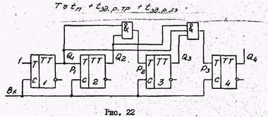 Период работы синхронного счетчика с параллельным переносом (рис.22) определяется соотнесением