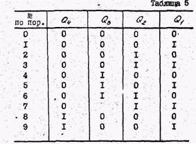 (недвоичнне счетчики). Среди них широкое применение находят двоично-десятичные счетчики с модулем счета M=10. Принципы построения синхронных счетчиков с произвольным коэффициентом счета рассмотрим на примере синтеза десятичного счетчика на JK-триггерах работающего в коде 8-4-2-1. Функционирование счетчика описывает таблица состояний (табл. 5), Преобразуем таблицу состояний счетчика к виду, удобному для определения функций возбуждения каждого триггера. Для этого вместо состояний триггеров укажем в таблице типы переходов каждого триггеpa при последовательной смене состояний счетчика. Так как триггер может иметь два устойчивых состояния (0 и 1) то возможны четыре типа переходов из текущего состояния