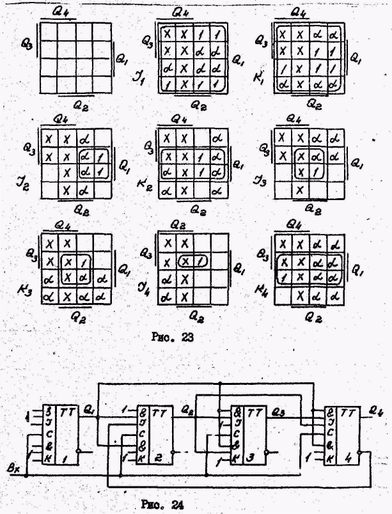 обозначен сигнал, который может иметь произвольное значение(0 или 1). В каждой строке табл. 6 отмечаются значения сигналов на входах триггеров, при которых обеспечивается требуемое переключение счетчика. Табл. 6 позволяет определить функции возбуждения управляющих входов J и K всех триггеров: