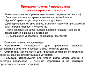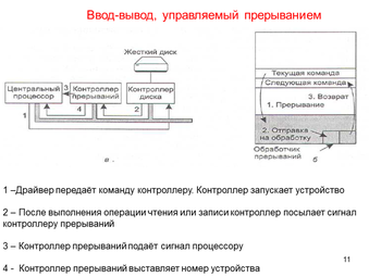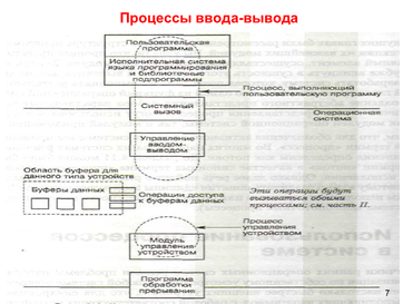Состоит из двух процессов: процесс, связанный с используемой программой и процесс, связанный с самим устройством ввода-вывода. Модуль управления устройством – драйвер. Синхронизация этих процессов происходит через буферизацию.