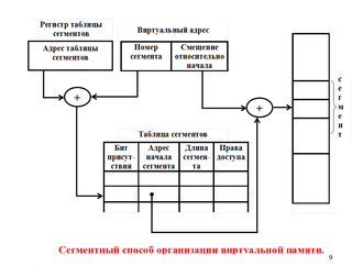 Сегментная организация преследует ту же идею, но сегменты, в отличие от страниц, могут иметь переменный размер. Каждый сегмент — линейная последовательность адресов, начинающихся с 0. Каждый сегмент имеет имя, размер, уровни привилегий и флаги. В отличие от страничной организации, где программист задает только 1 адрес, который разбивается на номер страницы и смещение, в сегментной схеме, программист должен самостоятельно указывать имя сегмента и смещение относительно его начала. Размер и кол-во сегментов зависит от того, как написана программа.