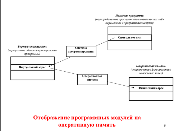 Виртуальное адресное пространство тождественно исходному пространству имен: отображение исходной программы на оперативную память выполняет ОС на основе таблицы символьных имен.