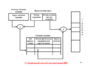 Адресное пространство основной и внешней памяти разбивается на блоки фиксированного размера, называемое страницами. Процесс загружается в память постранично. Каждый адрес, генерируемый процессором, состоит из 2 частей — номера страницы и смещения в пределах страницы. Таблица страниц содержит начальные адреса всех страниц, в которых размещена программа. Указатель на таблицу страниц хранится в PCB соответствующего процесса.