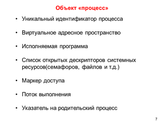 - Структура данных, содержащая всю информацию о процессе, в том числе список открытых дескрипторов различных системных ресурсов, уникальный идентификатор процесса, различную статистическую информацию и т.д.;