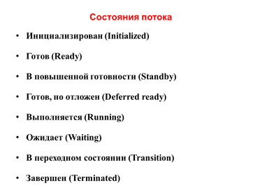 Процессы инертны. Отвечают же за исполнение кода, содержащегося в адресном пространстве процесса, потоки. Поток (thread) - некая сущность внутри процесса, получающая процессорное время для выполнения. В каждом процессе есть минимум один поток. Этот первичный поток создается системой автоматически при создании процесса. Далее этот поток может породить другие потоки, те в свою очередь новые и т.д. Таким образом, один процесс может владеть несколькими потоками, и тогда они одновременно исполняют код в адресном пространстве процесса. Каждый поток имеет: