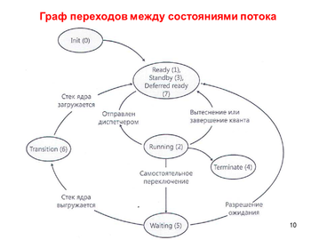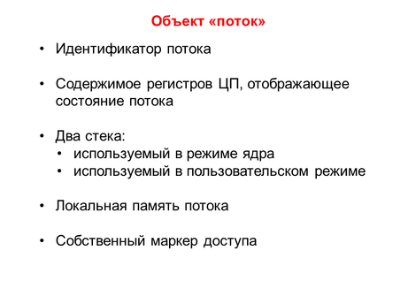 - Два стека, один из которых используется потоком при выполнении в режиме ядра, а другой - в пользовательском режиме;