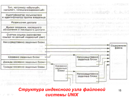 Кроме самих данных, файловая система UNIX предусматривает хранение информации о каждом файле в энергонезависимой памяти. Эта информация хранится в структуре, называемой индексным узлом файла. Индексный узел содержит много полей, в том числе поля с обозначением идентификаторов владельца и группы, целого числа с обозначением режима файла времени последнего доступа, времени последнего изменения, размера файла, дисковода и файловой системы, в которой находится файл, числа записей каталога для этого файла, числа дисковых блоков, используемых в настоящее время этим файлом, и основного типа (который определяет, например, является ли он обычным файлом или каталогом).