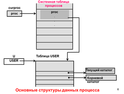 Каждому процессу соответствует контекст, в котором он выполняется. Этот контекст включает пользовательский контекст (т. е. содержимое виртуального адресного пространства, сегментов программного кода, данных, стека, разделяемых сегментов и сегментов файлов, отображаемых в виртуальную память), содержимое аппаратных регистров — регистровый контекст (регистр счетчика команд, регистр состояния процессора, регистр указателя стека и регистры общего назначения), а также структуры данных ядра (контекст системного уровня), связанные с этим процессом. Контекст процесса системного уровня в ОС UNIX состоит из «статической» и «динамических» частей. Для каждого процесса имеется одна статическая часть контекста системного уровня и переменное число динамических частей.