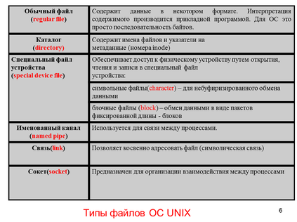 Содержимое регулярных файлов (информация, находящаяся в них, и способ ее организации) всецело определяется программистом, создающим файл. В отличие от регулярных, остальные типы файлов, содержащих данные, т. е. директории и связи, имеют жестко заданную структуру и содержание, определяемые типом используемой файловой системы.