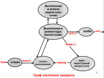 Новый процесс порождается системным вызовом fork, который создает дочерний процесс - копию родительского. В дочернем процессе выполняется та же программа, что и в родительском, и когда дочерний процесс начинает выполняться, он выполняется с точки возврата из системного вызова fork. Системный вызов fork возвращает родительскому процессу PID дочернего процесса, а дочернему процессу - 0. По коду возврата вызова fork дочерний процесс может "осознать" себя как дочерний. Свой PID процесс может получить при помощи системного вызова getpid, а PID родительского процесса - при помощи системного вызова getppid. Если требуется, чтобы в дочернем процессе выполнялась программа, отличная от программы родительского процесса, процесс может сменить выполняемую в нем программу при помощи одного из системных вызовов семейства exec. Все вызовы этого семейства загружают для выполнения в процессе программу из заданного в вызове файла и отличаются друг от друга способом передачи параметров этой программе.