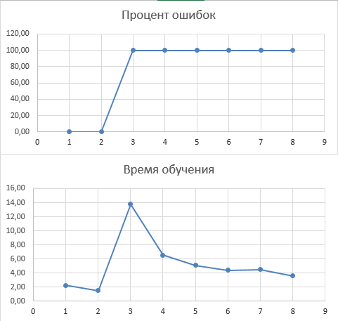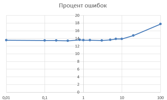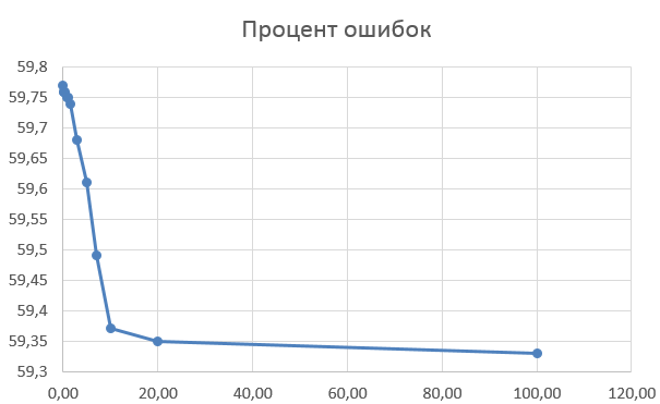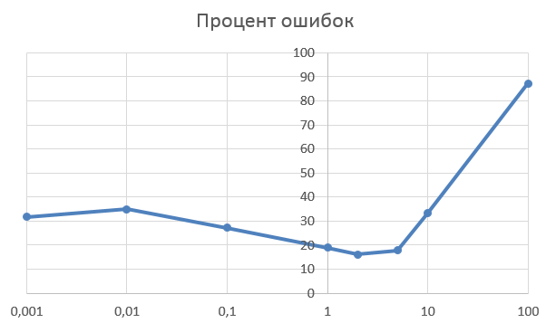 Процент ошибок был бы очень высоким, если бы мы ответы выбирали случайным образом. Процент ошибок приближался к 100% и был бы точно выше, чем те результаты, которые мы получили на обучаемой модели.