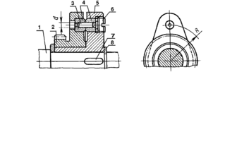 Поводковая муфта с разрушающимся элементом – штифтом (поводком) представлена на рис.2.2. Число штифтов –1 или 2, больше обычно не бывает. В номинальном режиме крутящий момент с зубчатого колеса 2, которое одновременно является левой полумуфтой, через штифт 3 передается на правую полумуфту 5. С правой полумуфты через шпонку 7 крутящий момент поступает на вал 1. При увеличении момента до максимальной величины штифт 3 срезается и момент на вал уже не передается. Чтобы восстановить работоспособности муфты необходимо отвернуть винт – заглушку 6, вынуть остатки штифта из полумуфт и вставить новый. Для обеспечения стабильности и точности срабатывания муфты в обе полумуфты запрессовывают два плунжера 4 из высокотвердой стали, при помощи которых стабилизируют процесс срезания штифтов. Стопорное разрезное кольцо 8 предохраняет муфту от произвольного перемещения вдоль вала. Материал для изготовления штифтов см. раздел 1.1. Материал для изготовления плунжеров – инструментальные стали, например, У8А, У10А и другие с последующей закалкой.