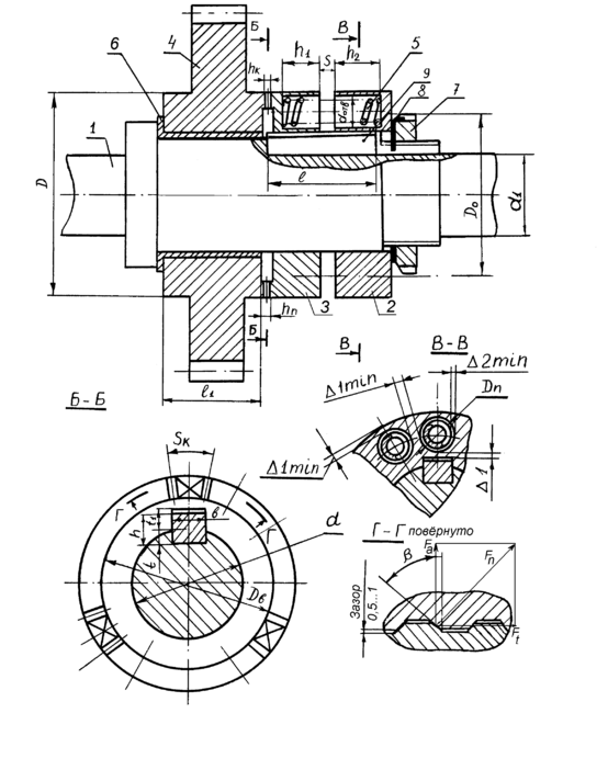 2.3.1 Кулачковая предохранительная муфта (рис.2.3). Муфта самоуправляемая, состоит из двух дисков – полумуфт с кулачками на соприкасающихся торцевых поверхностях. Кулачки в данном случае – трапецеидальные выступы с углом наклона β (сечение Г–Г) небольшой высоты. В качестве левой полумуфты может использоваться ступица зубчатого колеса 4, или другая подобная