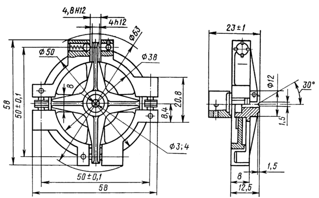 1.6. Крестовая муфта. Беззазорный (безлюфтовой) вариант крестовой муфты (рис.1.13) на основе узла Ольдгейма применяют в кинематических цепях высокой и самой высокой точности (до 0,5"). Муфта состоит из двух взаимно перпендикулярно расположенных поводков 2 и 3, одновременно являющихся и левой и правой полумуфтами. Своими боковыми выступами полумуфты входят в пазы крестовины 1 и защемляются между сухариками 7 и шариками 5 посредством пружин 6.