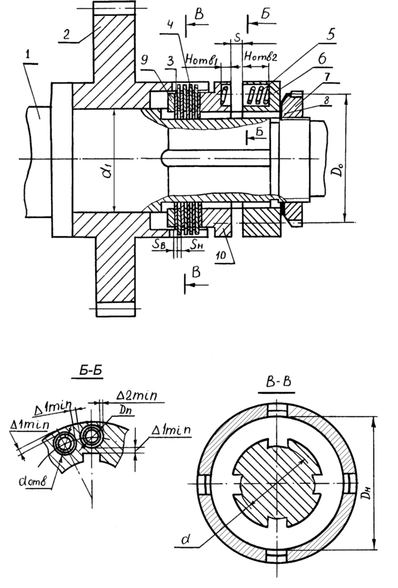 Размер h1 делается по возможности гораздо меньше размера ∆1min или h2 для уменьшения массы скользящей части 3 подвижной полумуфты (см. рис. 2.3).
