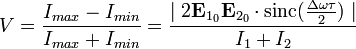 В итоговом соотношении слагаемое, содержащее тригонометрические множители, называется интерференционным членом. Оно отвечает за модуляцию интенсивности интерференционными полосами. Степень различимости полос на фоне средней интенсивности называется видностью или контрастом интерференционных полос: