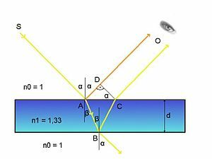 Интерференция в тонкой плёнке. Альфа — угол падения, бета — угол отражения, жёлтый луч отстанет от оранжевого, они сводятся глазом в один и интерферируют.