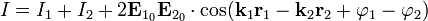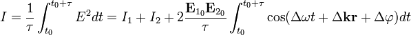 Пусть некоторый прибор, обладающий некоторым характерным временем регистрации (экспозиции), фотографирует интерференционную картину. В физической оптике интенсивностью называют усредненный по времени поток световой энергии через единичную площадку ортогональную направлению распространения волны. Время усреднения определяется временем интегрирования фотоприемника, а для устройств, работающих в режиме накопления сигнала (фотокамеры, фотопленка и т. п.), временем экспозиции. Поэтому приемники излучения оптического диапазона реагируют на среднее значение потока энергии. То есть сигнал с фотоприемника пропорционален: