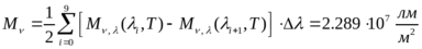 III. Для определения интегральных светимостей необходимо проинтегрировать известные спектральные плотности светимостей по длине волны в пределах заданного диапазона длин волн. Стоит отметить, что для спектральной плотности энергетической светимости нам известна функциональная зависимость, поэтому можно брать интеграл в чистом виде, но для спектральной плотности световой светимости известны лишь дискретные значения, поэтому необходимо воспользоваться формулой приближенного вычисления интегралов, например, формулой трапеций (данная формула применима, так как светимость хорошо аппроксимируется ломаной линией). Учитывая сделанные выше замечания, получаем значения интегральных светимостей: