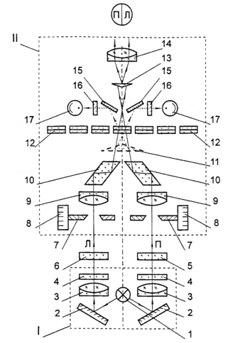 Основными узлами фотометра ФМ-58 (рис. 1) являются осветитель I и фотометрическая головка II. Осветитель I, состоящий из лампы накаливания 1, плоских зеркал 2, конденсоров 3, рассеивающих фильтров 4, создает равномерное освещение в плоскости измерительных диафрагм 7, связанных с измерительными барабанами 8. Два световых пучка, прошедших объективы 9 и ромбические призмы 10, идут под углом один к другому. При визуальных измерениях пучки попадают на бипризму 13, которая отклоняет их к оси окуляра 14. При этом правый пучок П, попадая на левую половину бипризмы, создает яркость левого поля зрения окуляра, а левый пучок Л, попадая на правую половину бипризмы, создает яркость правого поля зрения. При фотоэлектрических измерениях в схему фотометра включают призму 11. Пучки отклоняются призмой 11, отражаются зеркалами 15 и попадают на матовые стекла 16 и установленные за ними фотоэлементы 17. Фотоэлементы включены по дифференциальной схеме через усилитель на гальванометр, регистрирующий разность возникающих на них фототоков.
