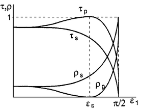 коэффициент отражения для составляющей электрического вектора, лежащей в плоскости падения, равен нулю. Этот угол называют углом Брюстера и рассчитывают по формуле: