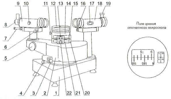 2.11. Совместить центр автоколлимационного перекрестия с вертикальным штрихом сетки окуляра зрительной трубы, поворачивая платформу 21 микрометренным винтом 20.
