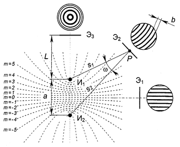 Интерференционная картина характеризуется шириной полосы – наименьшим расстоянием между двумя ближайшими максимумами или минимумами интенсивности. Если удаление экрана от источников намного больше расстояния между ними, то ширину полосы можно вычислить по формуле