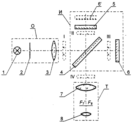 . Осветитель О формирует пучок лучей малой расходимости. Собственно интерферометр И, образованный светоделительной пластиной 4 и зеркалами 5 и 6, создает на выходе интерферирующие пучки. Вышедший из осветителя пучок делится светоделительной пластиной 4 на два, один из которых отражается зеркалом 5, а другой - зеркалом 6. Отраженные зеркалами пучки вновь делятся светоделителем 4 и образуют две пары интерферирующих пучков, одна из которых распространяется в направлении зрительной трубы Т, другая - в направлении осветителя О. Зрительную трубу, состоящую из объектива 7 и окуляра 8, используют для юстировки интерферометра и наблюдения интерференционной картины.