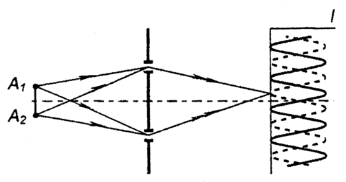 - его показатель преломления, необходимо ограничивать размер источника, так как максимумы интенсивности в интерференционных картинах от различных точек источника смещены относительно друг друга, что снижает контраст суммарной интерференционной картины.