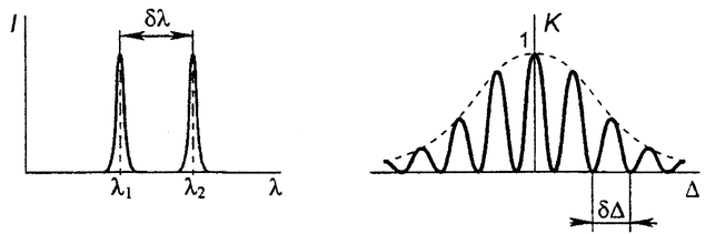 . При более сложном спектральном составе излучения закон изменения контраста усложняется. Например, если источник излучает две узкие спектральные линии равной интенсивности (рис. 7а), то закон изменения контраста, определяемый спектром одной линии (штриховая кривая на рис. 7б) модулируется косинусоидальной функцией. Результирующая зависимость контраста изображена непрерывной кривой на рис 76. Дополнительные нули появляются при таких значениях