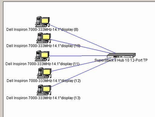 Для объединения рабочих станций в сегмент вам необходим концентратор. Найдите модель SuperStack II Hub 10 12-Port TP в разделе Hubs/Shared Media/Ethernet/3Com Corp. Переместите его на рабочую область: