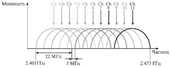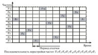 1) FHSS (Frequency Hopping Spread Spectrum) – метод скачкообразной перестройки частоты. Метод заключается в периодическом скачкообразном изменении несущей частоты по некоторому алгоритму, известному приемнику и передатчику. Преимущество метода — простота реализации. Метод используется в Bluetooth. Хоть занимается и весь частотный диапазон, но в каждый момент времени используется только одна частота.
