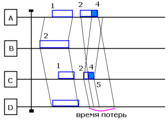 Момент 4 – обнаружение коллизии станциями A и С. Передача кадров прекращается, передаётся сигнал затора;