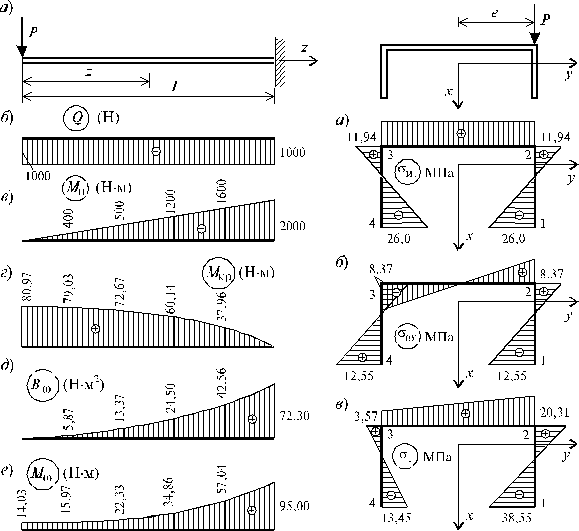 согласно выражения (19.11). Опасным сечением является сечение в заделке, так как в нем действуют наибольшие по величине My и