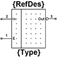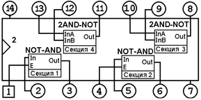 Исходные данные для создания символов. Микросхема К511ПУ2 содержит 2 символа NOT–AND «НЕ с расширением по И» (рисунок 1 - сверху) и два символа 2AND–NOT «2И-НЕ» (рисунок 1 - снизу). Нумерация выводов символов на рисунке 1 указывает порядок их создания в редакторе Symbol Editor. Корпус ИМС К511ПУ2 показан на рисунке 3. Каждый символ занимает внутри ИМС одну секцию. Все секции перенумерованы. Например, в ИМС К511ПУ2 символы NOT–AND занимают секции 1 и 2, а символы 2AND–NOT – секции 3 и 4. Выводы с именами E, In и Out 1-го символа NOT–AND (секции А) распаяны в корпусе ИМС на ножки 1, 2 и 3 соответственно. Те же выводы секции В распаяны на ножки 4, 5 и 6. Выводы 1-го символа 2AND–NOT с именами InA, InB и Out (секция С ИМС) распаяны на ножки 9, 10 и 8, а те же выводы секции D распаяны на ножки 13, 12 и 11. Сказанное поясняют рисунки 2 и 3.
