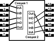 Исходные данные. Микросхема 133ЛА6 содержит 2 символа 4AND–NOT «4И-НЕ», показанного на рисунке 11. Нумерация выводов символа указывает порядок их формирования при создании символа в среде редактора Symbol Editor. Корпус ИМС 133ЛА6 показан на рисунке 12. В микросхеме 133ЛА6 символ 4AND–NOT занимает секцию 1 и секцию 2. Распайка выводов секций на ножки ИМС показана на рис. 12.