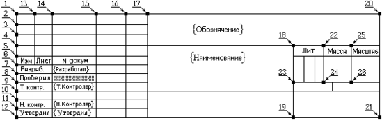 аналогично ввести остальные «пустышки», показанные на рисунке 38, введя имя {Разработал} в точку 259/42, {Наименование} в точку 318/46, имя {Т. контроль} в точку 259/32, имя {Н. контроль} в точку 259/22, имя имя {ФИО утвердил} в точку 258/17, имя {Обозначение} в точку 318/62.