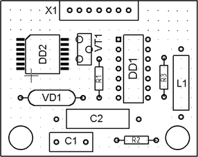 Установить на ПП 2 монтажных отверстия N6p0-2p7C на ПП, для чего: после Options >PadStyle дважды щелкнуть LB на имени N6p0-2p7C – и после Place >Pad щелкнуть LB в точках: 115/65 , 155/65 , щелкнуть RB.